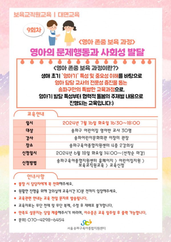 | 장소 | 송파구육아종합지원센터 4층 2강의실 | 대상 | 송파구 관내 영아반 보육교직원 |