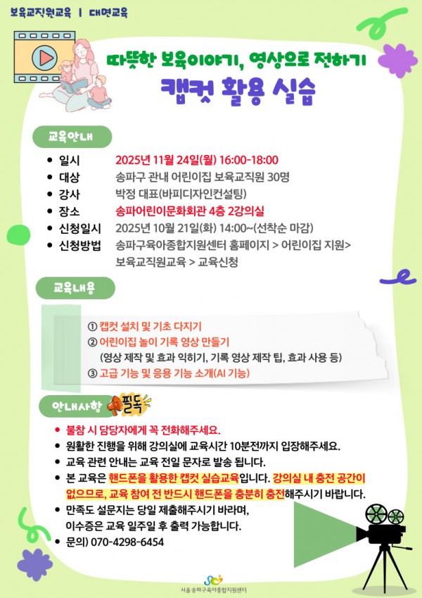 | 장소 | 송파어린이문화회관 4층 2강의실 | 대상 | 송파구 관내 어린이집 보육교직원 |