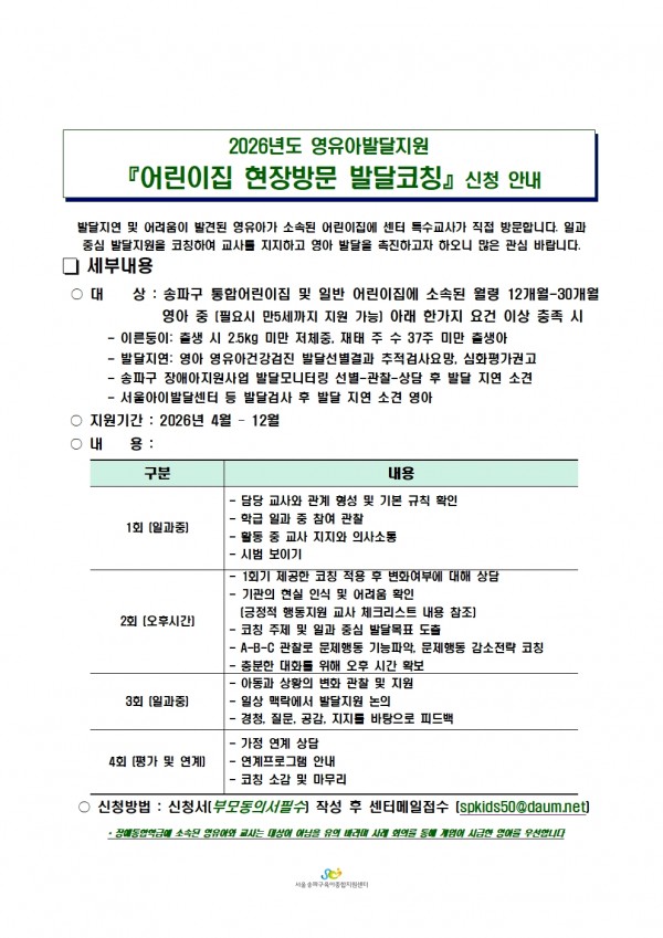 | 장소 | 관내 어린이집 현장 | 대상 | 이른둥이, 발달지연 유아 및 지연소견 영유아 |