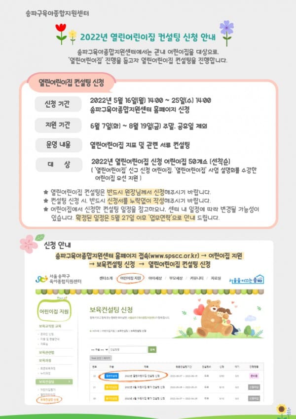 | 장소 | 신청 어린이집 or 송파구육아종합지원센터 | 대상 | '열린어린이집'을 준비중인 송파구 관내 어린이집 |
