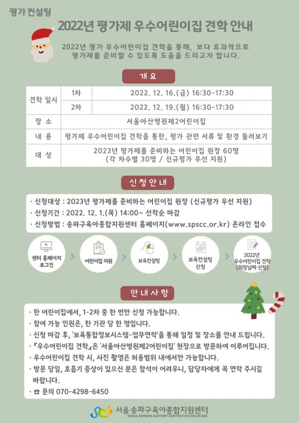 ♥ 한 어린이집에서, 1-2차 중 한 번만 신청 가능합니다. ♥ 참여 가능 인원은, 한 기관 당 한 명입니다. ♥ 신청 마감 후, '보육통합정보시스템-업무연락'을 통해 일정 및 장소를 안내 드립니다. ♥ 우수어린이집 견학 시, 사진 촬영은 허용범위 내에서만 가능합니다. ♥ 우수어린이집 견학은 '서울아산병원제2어린이집' 현장으로 방문하여 이루어집니다. ♥ 방문 당일, 호흡기 증상이 있으신 분은 참석이 어려우니, 담당자에게 꼭 연락 주시길 바랍니다. |