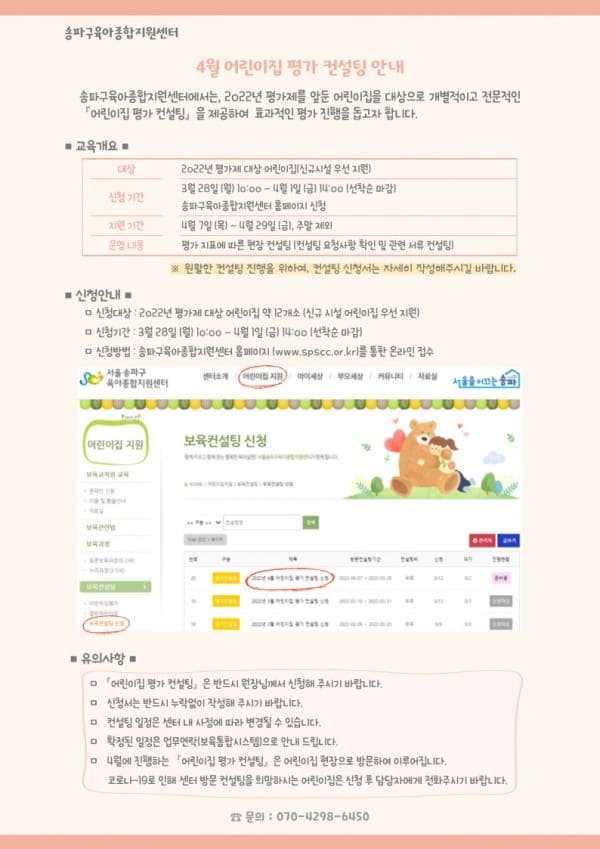 | 장소 | 신청 어린이집 | 대상 | 2022년 어린이집 평가 대상 어린이집(신규 시설 우선 지원) |
