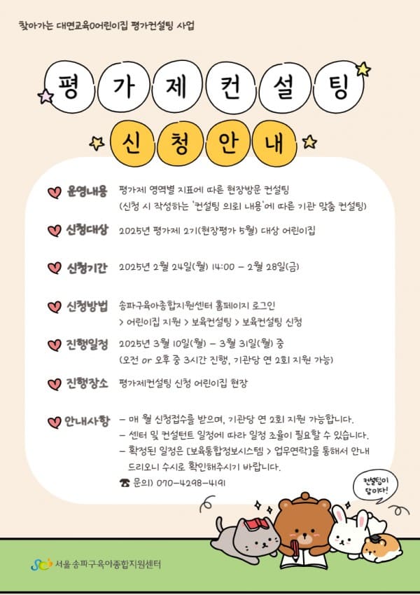 ★ 필수확인사항 ★ ① 원활한 컨설팅 진행을 위하여, 신청서 내용을 정확하게 작성해주시기 바랍니다. ('컨설팅 의뢰 내용' 작성 필수!) ② '어린이집 평가제 컨설팅'은 기관당 연간 2회까지 지원 가능합니다. ③ 컨설팅 진행은, 오전 or 오후 중 3시간 동안 진행됩니다 (오전: 9시 30분~10시부터 3시간 진행 / 오후: 13시~16시) ④ 확정된 일정은 '보육통합정보시스템(업무연락)'을 통해 안내드리니, 수시로 확인하여 주시기 바랍니다. ☎ 문의 070-4298-4191 |