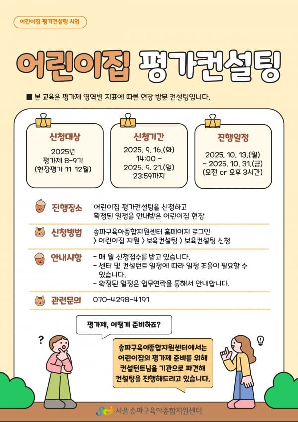 | 장소 | 신청 어린이집 현장 | 대상 | 2025년 평가제 8-9기(현장평가 11-12월) 대상 어린이집 |