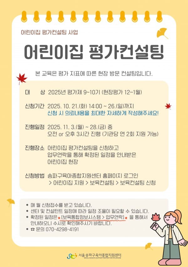 ★ 필수확인사항 ★ ① 원활한 컨설팅 진행을 위하여, 신청서 내용을 정확하게 작성해주시기 바랍니다. ('컨설팅 의뢰 내용' 작성 필수!) ② '어린이집 평가제 컨설팅'은 기관당 연간 2회까지 지원 가능합니다. ③ 컨설팅 진행은, 오전 or 오후 중 3시간 동안 진행됩니다 (오전: 9시 30분~10시부터 3시간 진행 / 오후: 13시~16시) ④ 확정된 일정은 '보육통합정보시스템(업무연락)'을 통해 안내드리니, 수시로 확인하여 주시기 바랍니다. ☎ 문의 070-4298-4191 |