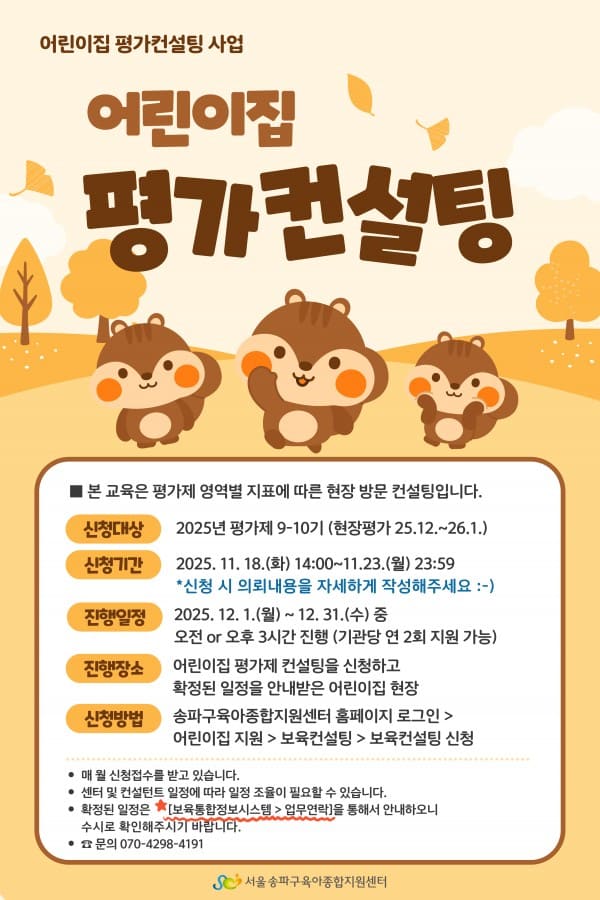 ★ 필수확인사항 ★ ① 원활한 컨설팅 진행을 위하여, 신청서 내용을 정확하게 작성해주시기 바랍니다. ('컨설팅 의뢰 내용' 작성 필수!) ② '어린이집 평가제 컨설팅'은 기관당 연간 2회까지 지원 가능합니다. ③ 컨설팅 진행은, 오전 or 오후 중 3시간 동안 진행됩니다 (오전: 9시 30분~10시부터 3시간 진행 / 오후: 13시~16시) ④ 확정된 일정은 '보육통합정보시스템(업무연락)'을 통해 안내드리니, 수시로 확인하여 주시기 바랍니다. ☎ 문의 070-4298-4191 |
