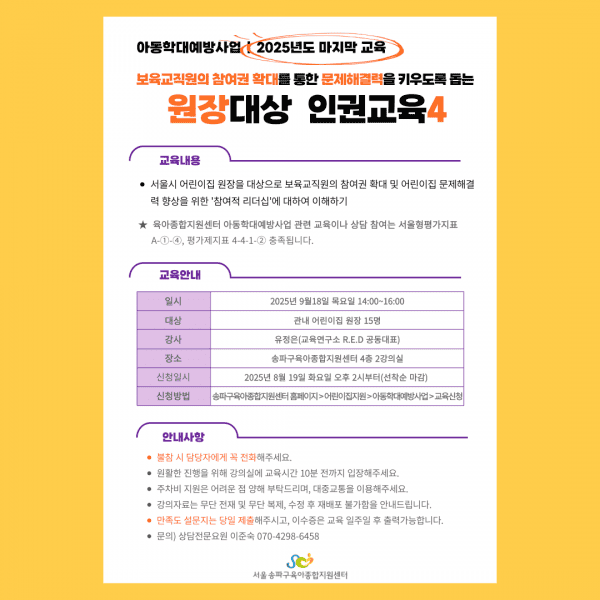 | 장소 | 센터 4층 2강의실 | 대상 | 관내 어린이집 원장 |