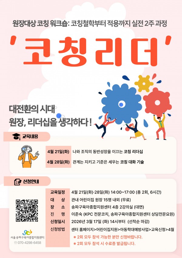 『코칭리더』를 진행하오니 관내 어린이집 원장님들의 적극적인 관심과 참여 부탁드립니다.