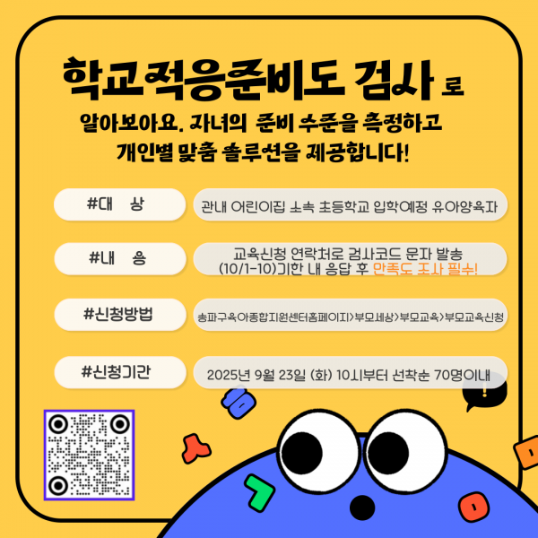 | 온라인코드 발송 * 신청한 양육자 선착순 70명에게 학교적응준비도검사 온라인 코드 발송 |