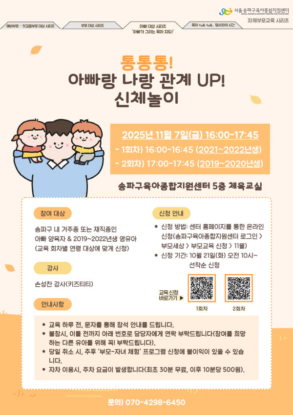 | 장소 | 송파구육아종합지원센터 5층 체육교실 | 대상 | 관내 거주중 또는 재직중인 아빠 양육자 & 2021~2022년생 영유아 |