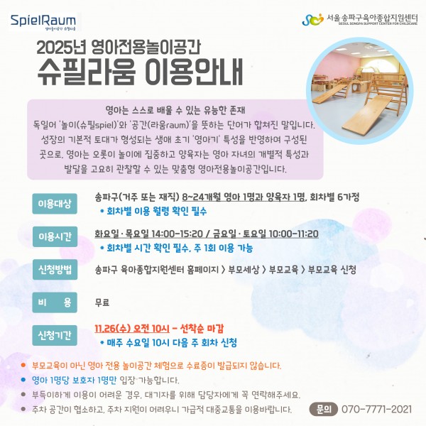 | 장소 | 3층 슈필라움 | 대상 | 8-15개월 영아 및 보호자 1명 |