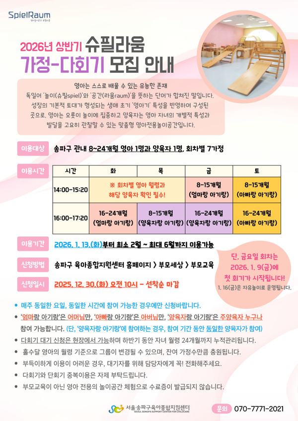 | 장소 | 3층 슈필라움 | 대상 | 송파구 관내 8-15개월 영아와 엄마 |