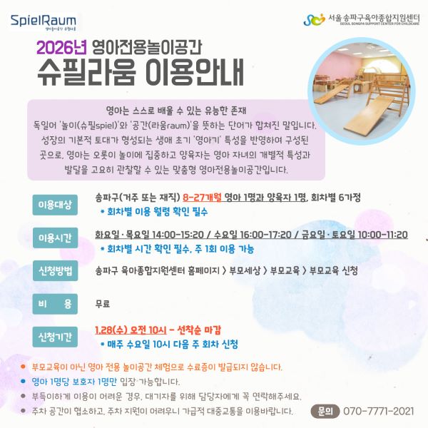 | 장소 | 3층 슈필라움 | 대상 | 송파구 관내 17-27개월 영아 및 양육자 1명 |
