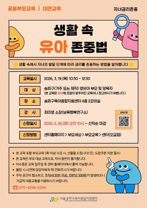 | 장소 | 송파구육아종합지원센터 4층 2강의실 | 대상 | 관내 영유아 부모 및 양육자 |