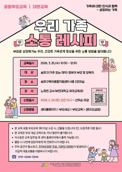 | 장소 | 송파구육아종합지원센터 4층 2강의실 | 대상 | 관내 영유아 부모 및 양육자 |