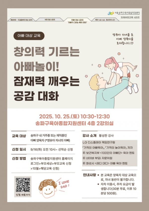 | 장소 | 송파구육아종합지원센터 4층 2강의실 | 대상 | 관내 거주중 또는 재직중인 아빠 양육자(*영유아 자녀의 아빠) |