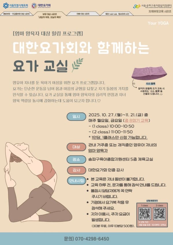 | 장소 | 송파구육아종합지원센터 5층 체육교실 | 대상 | 관내 거주중 또는 재직중인 영유아 자녀의 엄마 양육자 |