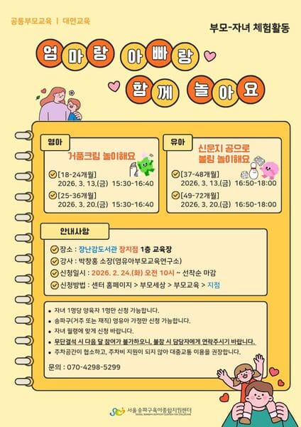 | 장소 | 장난감도서관 장지점 1층 교육장 | 대상 | 송파구 관내 37-48개월 유아 및 양육자 |