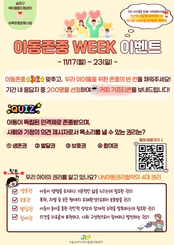 송파구육아종합지원센터에서는 보육존중문화확산을 위해 2025년 아동존중 WEEK 이벤트를 진행하고자 합니다:)