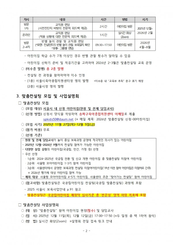 - 제출 이메일: spkids50@daum.net (※ 메일 제목: 2026년 맞춤컨설팅 신청-00어린이집)