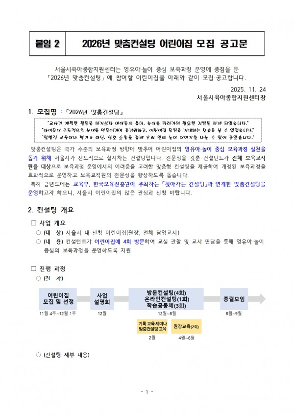 - 붙임 1. 2026년 맞춤컨설팅 어린이집 모집 공고문.hwp (120.0K) 1회 다운로드 | DATE : 2025-11-25 14:56:32