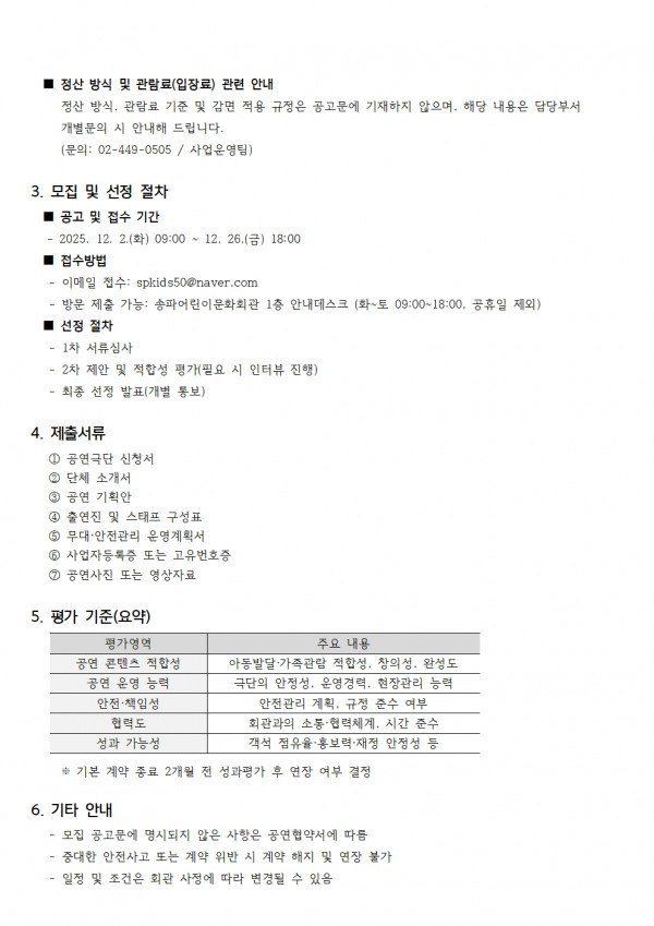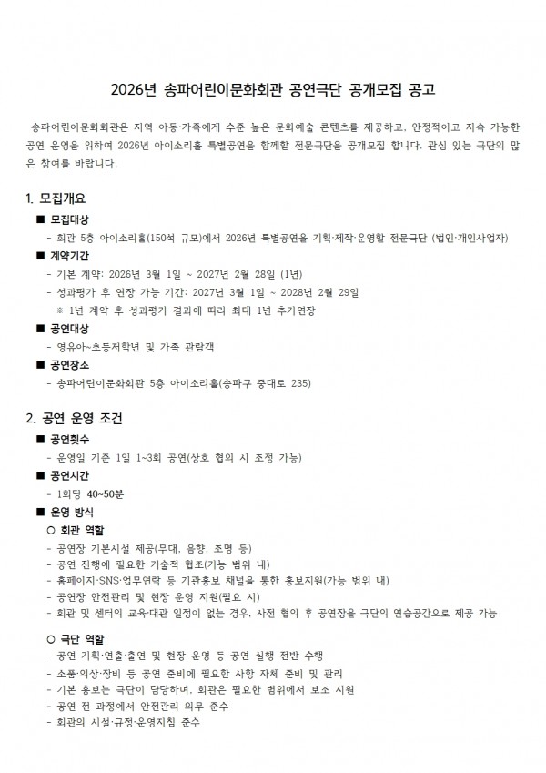 유관기관 송파어린이문화회관 공연극단 공개모집 공고(25.12.09 ~ 25.12.26) 페이지 정보 작성자 관리자05 댓글 0건 조회 55회 작성일 2025-12-02 13:16 첨부파일 극단모집공고.pdf (64.7K) 2회 다운로드 | DATE : 2025-12-02 13:16:53 제출서류.hwp.hwp (36.5K) 2회 다운로드 | DATE : 2025-12-02 13:16:53 본문 목록