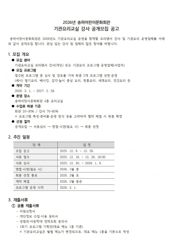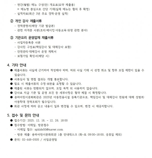 유관기관 송파어린이문화회관 기관요리교실 강사 모집 페이지 정보 작성자 관리자05 댓글 0건 조회 16회 작성일 2025-12-17 09:50 첨부파일 기관요리 모집공고.pdf (57.7K) 0회 다운로드 | DATE : 2025-12-17 09:50:43 제출서류hwp.hwp (53.5K) 0회 다운로드 | DATE : 2025-12-17 09:50:43 본문 목록