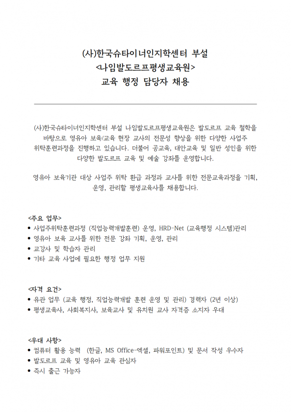 <나임발도르프평생교육원> 교육 행정 담당자 채용