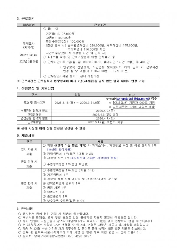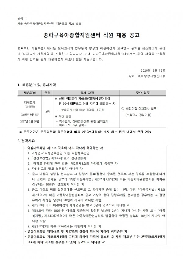 센터소식 [송파구육아종합지원센터] 직원(대체교사) 채용공고(~3/31) 페이지 정보 작성자 관리자22 댓글 0건 조회 10회 작성일 2026-03-16 16:50 첨부파일 붙임1.송파구육아종합지원센터 채용공고문대체교사.pdf (113.6K) 1회 다운로드 | DATE : 2026-03-16 16:50:35 붙임2.지원서 및 개인정보수집이용제공에 관한 동의서.hwp (92.5K) 1회 다운로드 | DATE : 2026-03-16 16:50:35 본문 목록