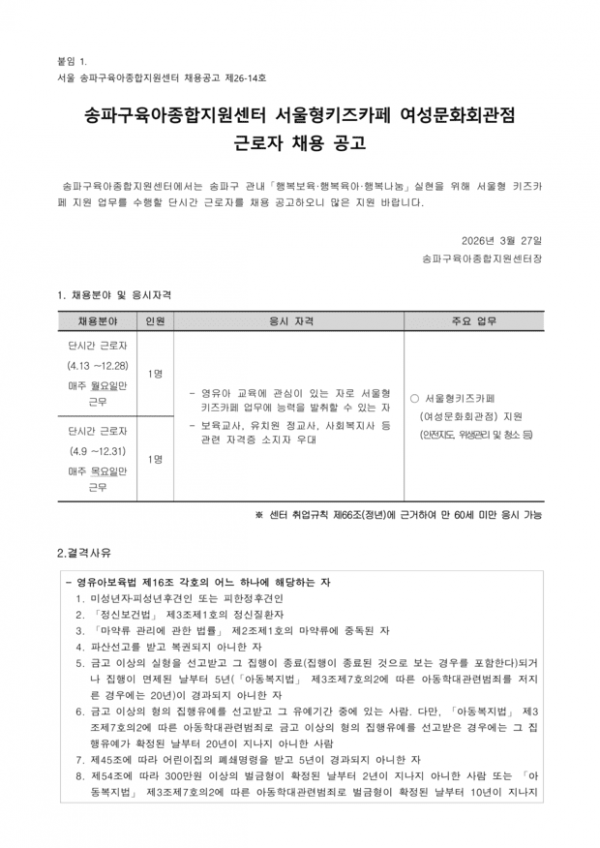 - 붙임1.여성문화회관점단시간근로자송파구육아종합지원센터채용공고문26.3.pdf (107.8K) 1회 다운로드 | DATE : 2026-03-27 18:23:20