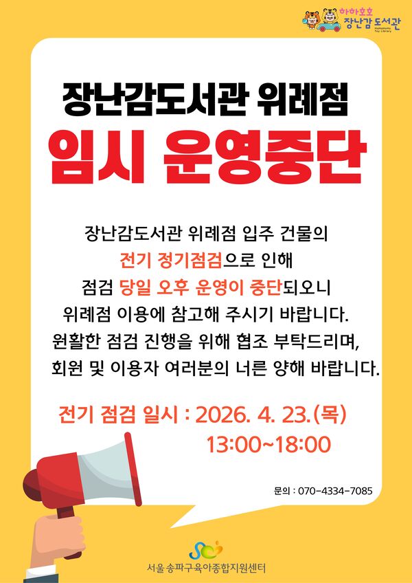 [장난감도서관] 위례점 전기 정기검사로 인한 임시 운영중단 안내