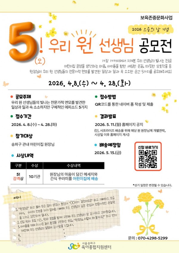 센터소식 [송파구육아종합지원센터] 2026년 스승의 날 기념 「5(오)! 우리 원 선생님 공모전」 안내