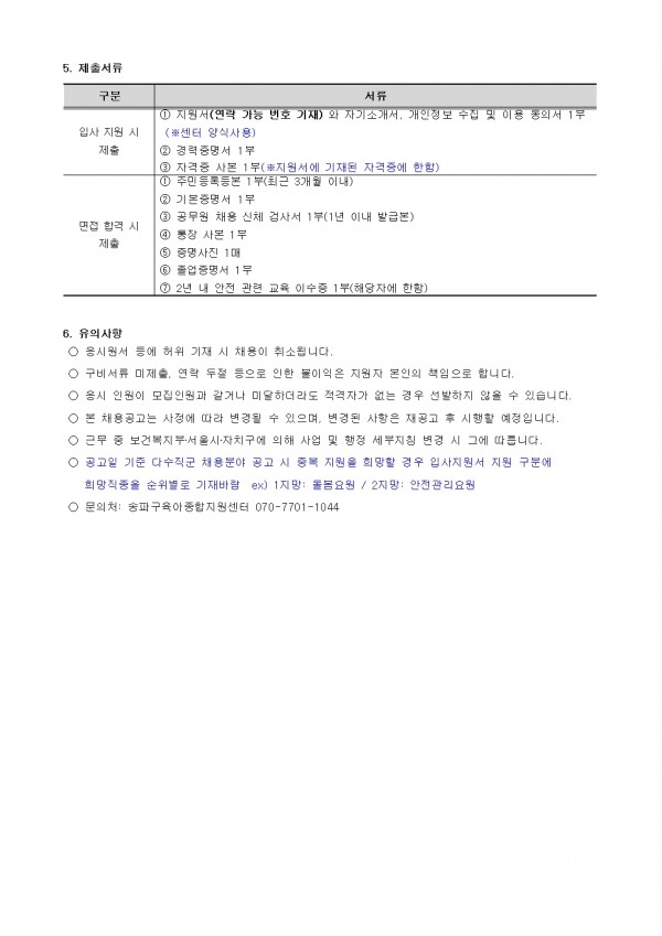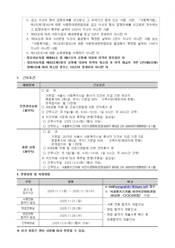 [송파구육아종합지원센터] 서울형키즈카페 직원(계약직) 채용공고(~11/19) 페이지 정보 작성자 관리자03 댓글 0건 조회 401회 작성일 2025-11-01 14:26 첨부파일 붙임1.채용공고-서울형키즈카페3.hwp (119.5K) 13회 다운로드 | DATE : 2025-11-01 14:26:56 중복지원 붙임2.지원서및개인정보수집이용제공에관한동의서.hwp (77.5K) 7회 다운로드 | DATE : 2025-11-01 14:26:56 본문 목록