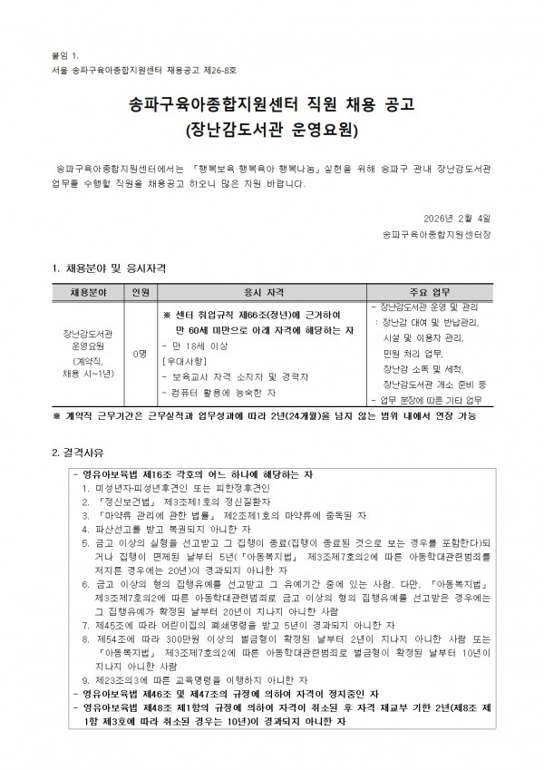 [송파구육아종합지원센터] 직원(장난감도서관 운영요원) 채용공고(~2/22) 페이지 정보 작성자 관리자20 댓글 0건 조회 224회 작성일 2026-02-06 09:17 본문 - 목록