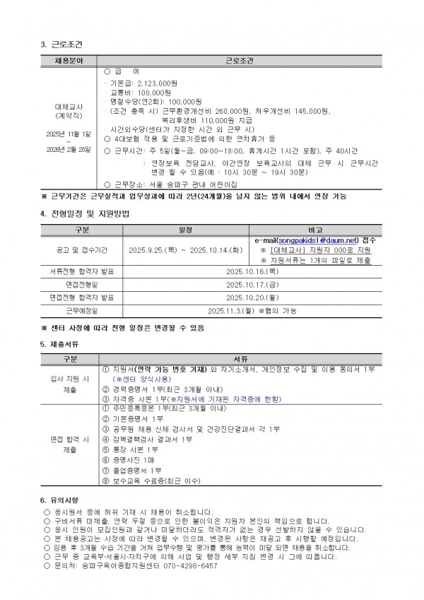 [송파구육아종합지원센터] 직원(대체교사) 채용공고(~10/14)