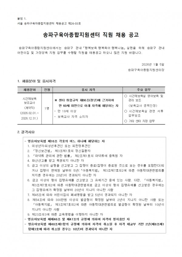 [송파구육아종합지원센터] 시간제보육 보조교사 채용 공고 페이지 정보 작성자 관리자03 댓글 0건 조회 93회 작성일 2026-01-05 18:44 첨부파일 붙임1.송파구육아종합지원센터채용공고문.pdf (92.6K) 5회 다운로드 | DATE : 2026-01-05 18:44:32 붙임2.시간제보조교사지원서 및 개인정보수집이용제공에 관한 동의서.hwp (45.0K) 1회 다운로드 | DATE : 2026-01-05 18:44:32 본문 목록