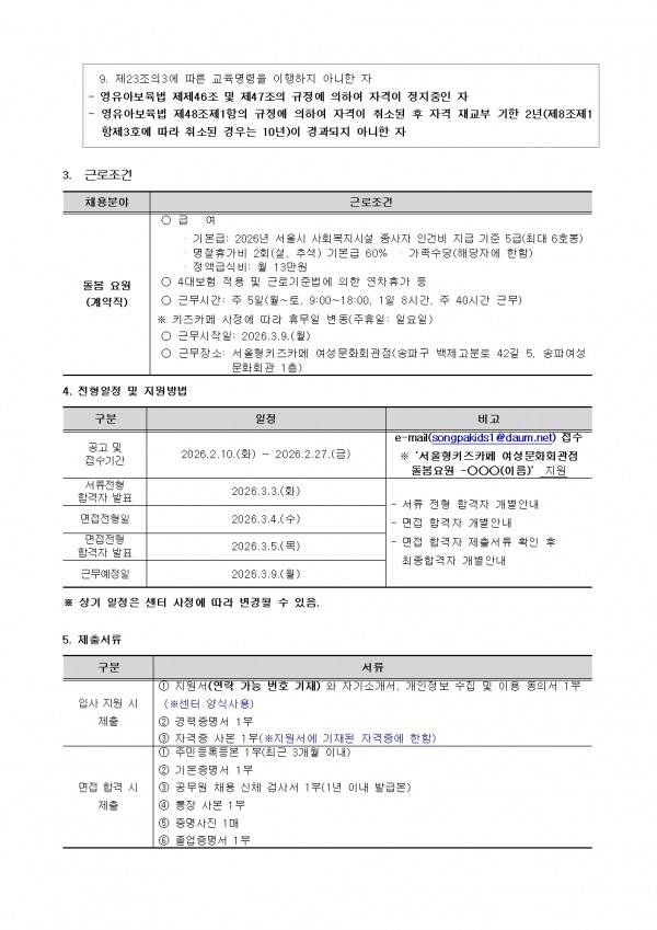 [송파구육아종합지원센터] 직원(서울형키즈카페 돌봄요원) 채용공고(~2/27)