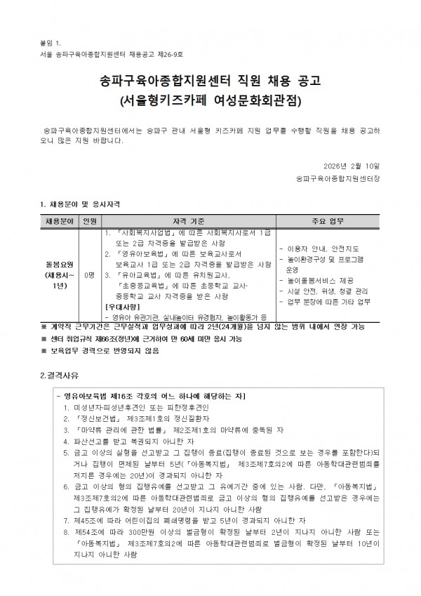 - 붙임1.채용공고-서울형키즈카페돌봄.pdf (100.6K) 13회 다운로드 | DATE : 2026-02-11 17:23:21